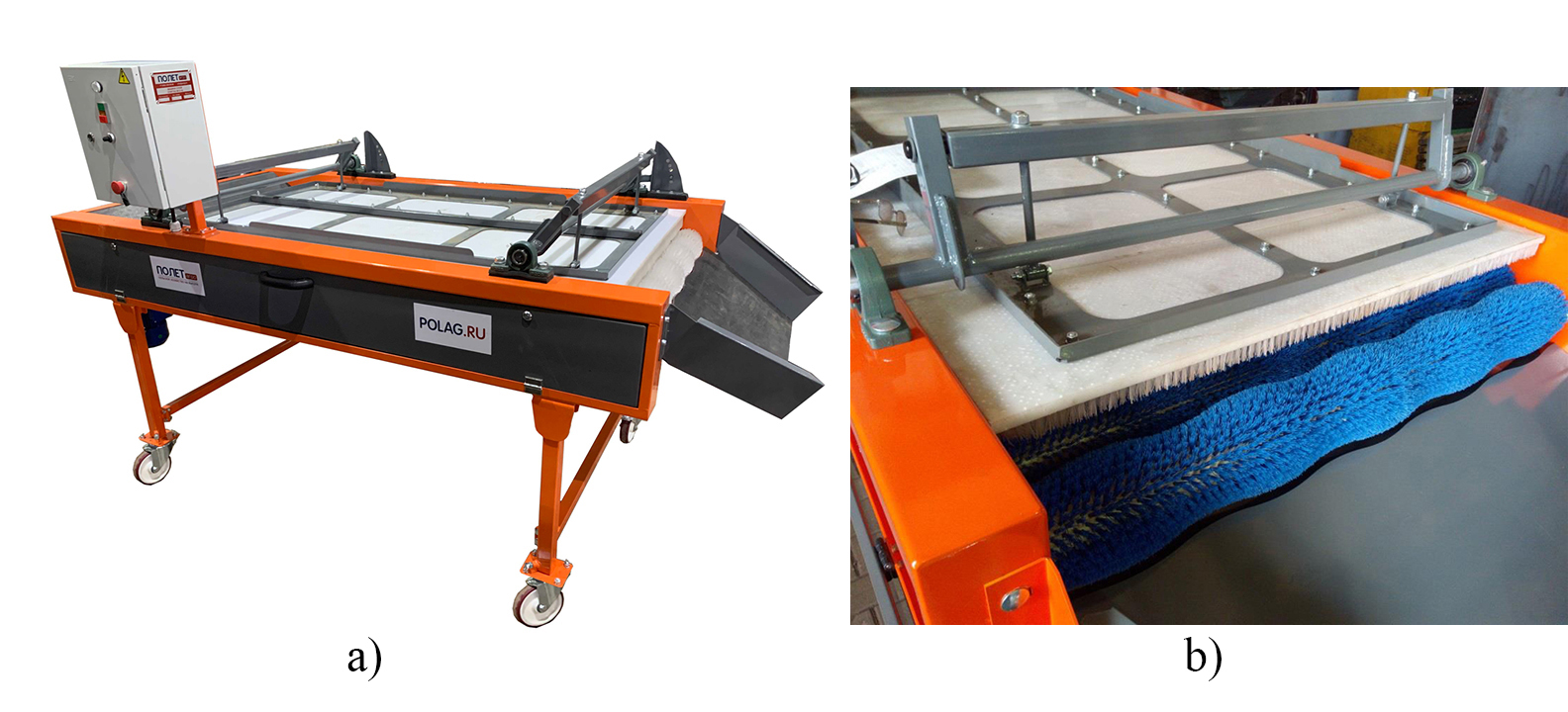 Fig. 1. Machine for dry cleaning of vegetables MSO-1011: a) general view; b) main working element
