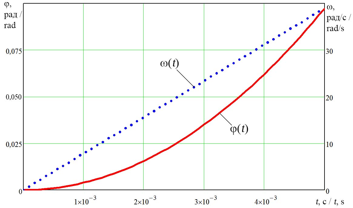 Изменения углового перемещения φ(t) и угловой скорости ω(t) диска в зависимости от времени его нахождения на вращающихся роликах до достижения им линейной скорости вращения ролика приведены на рисунке 5.
