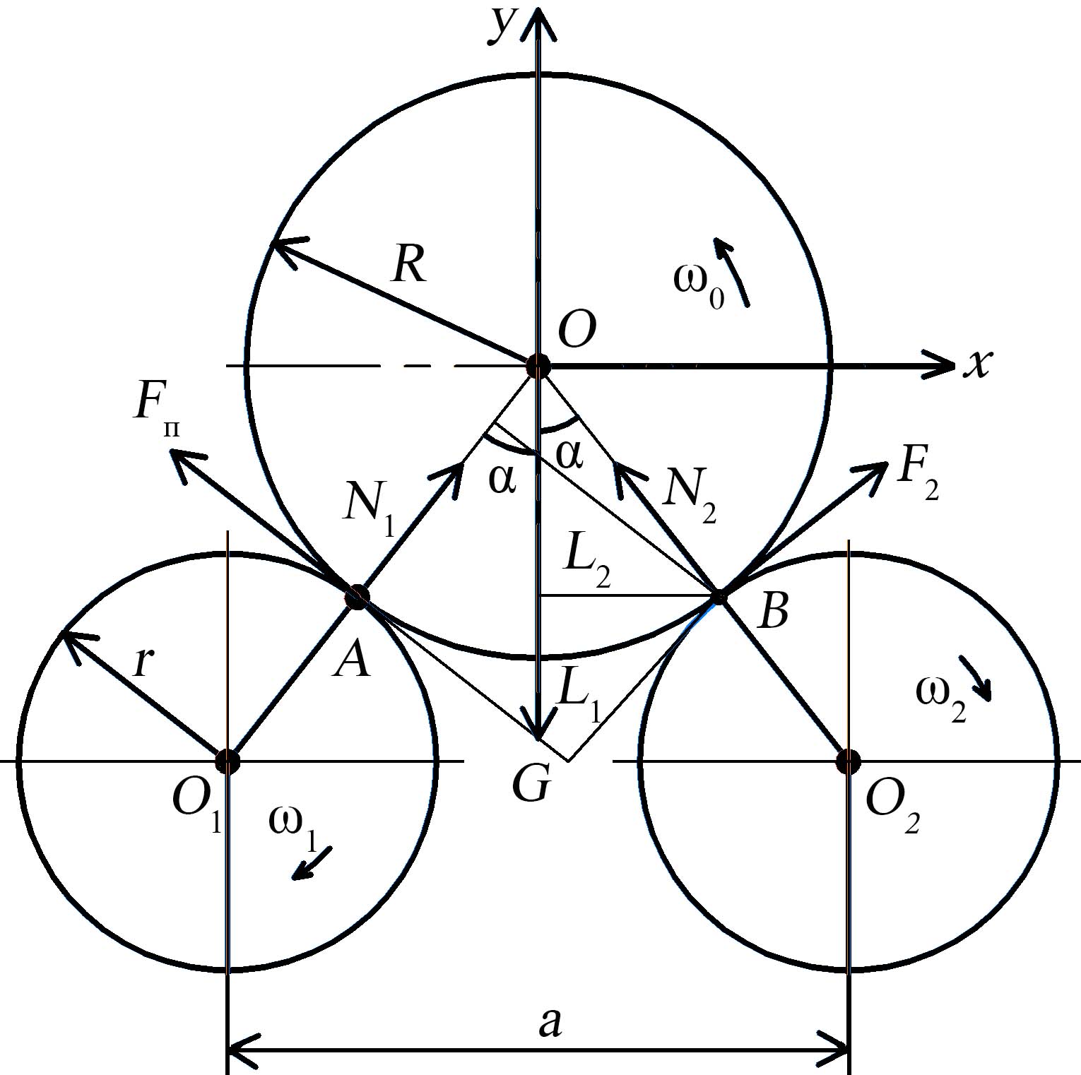 Рис. 4. Силы, действующие на диск при его расположении на вращающихся роликах