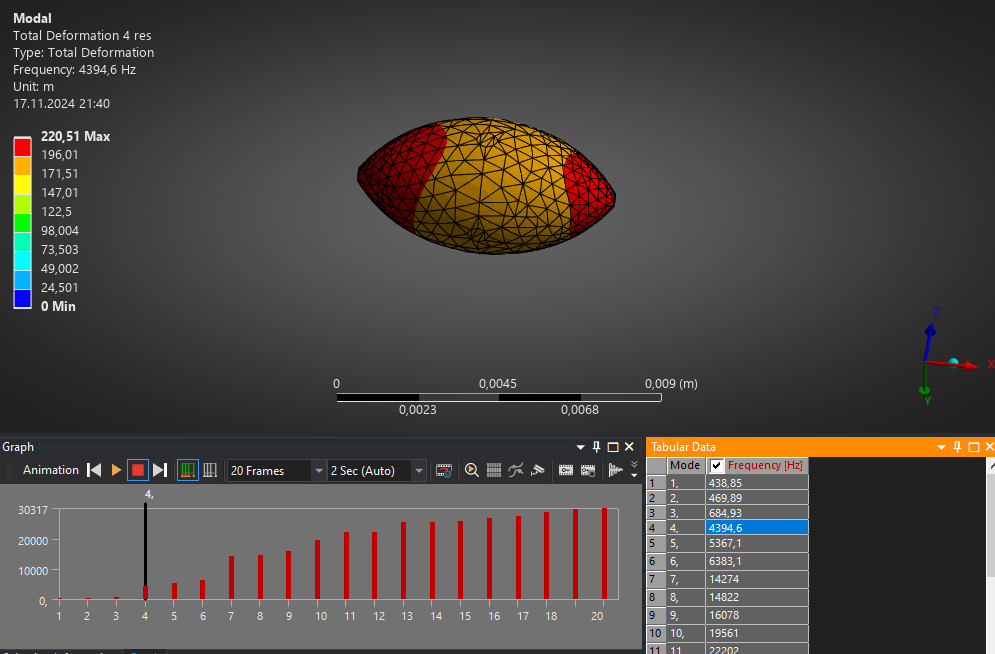 Рис. 3. Собственная частота и форма колебаний для зерна ячменя для 4 394 Гц