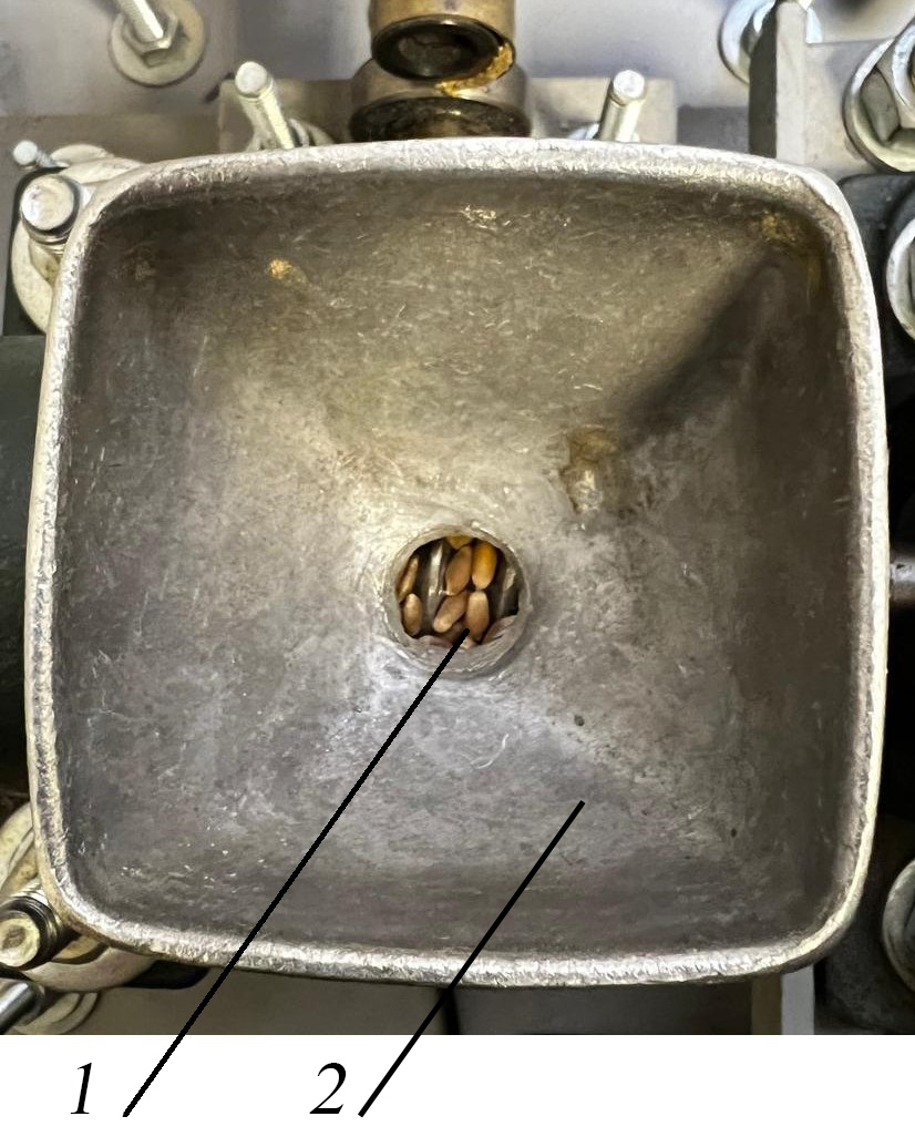 В формулах (1), (2) k1 – коэффициент заполнения бункера зерном ячменя; k2 – коэффициент заполнения бункера зерном ячменя при правильной ориентации, выражаемый в процентах, измеряемый в интервале от 0 до 1. Естественно, что k2 > k1, поэтому и Q2 > Q1. Таким образом, баланс производительности размалывающих устройств имеет четкую специфику и подчиняется определенным закономерностям. Правильная ориентация зерна ячменя в жерновах существенно повышает производительность размола благодаря нескольким ключевым факторам. Во-первых, она позволяет равномерно распределять нагрузку на рабочие поверхности жерновов, что снижает их износ и обеспечивает стабильную работу оборудования. Во-вторых, зерно, попадающее в зону размола под оптимальным углом, создает меньшее сопротивление, что уменьшает энергозатраты на процесс. Кроме того, ориентация зерен способствует более эффективному разрыву оболочки и измельчению ядра, что улучшает однородность получаемого продукта (рис. 1).