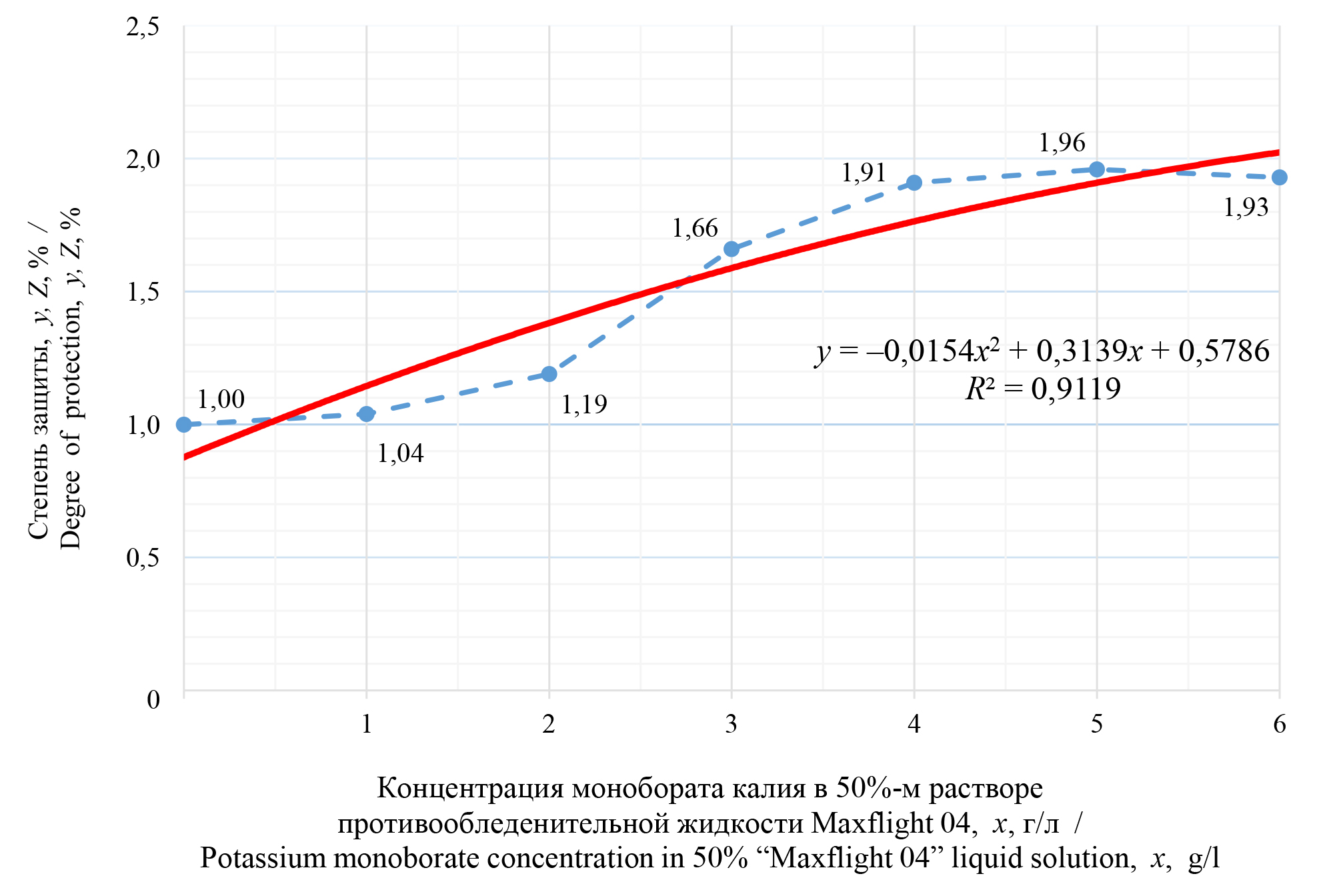 При обработке самолета 75–80 % состава стекает на землю [8], часть сдувается ветром во время взлета ВС. Это негативно влияет на окружающую среду, что обусловливает необходимость повышения экологических свойств ПОЖ [3; 4; 6]. В первую очередь желательно заменить входящие в состав ПОЖ токсичные ингибиторы коррозии на нетоксичные, поэтому исследования по разработке эффективных и нетоксичных ингибиторов коррозии являются актуальными и востребованными. В качестве такого ингибитора коррозии впервые предлагается использовать моноборат калия (KBO2) (МБК), что составляет научную новизну исследования.