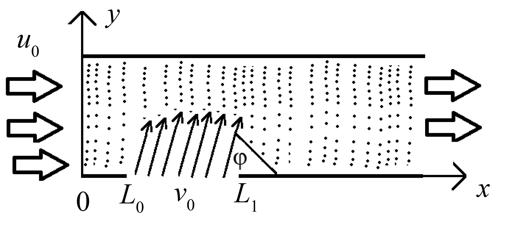 Note: u0 is the longitudinal velocity of gas and dust fraction; v0 is the longitudinal velocity of transverse injection of gas and droplet fractions; y is the transverse coordinate; x is the longitudinal coordinate; L0 is the right longitudinal coordinate of the injection surface; L1 is the left longitudinal coordinate of the injection surface; φ is the injection angle.