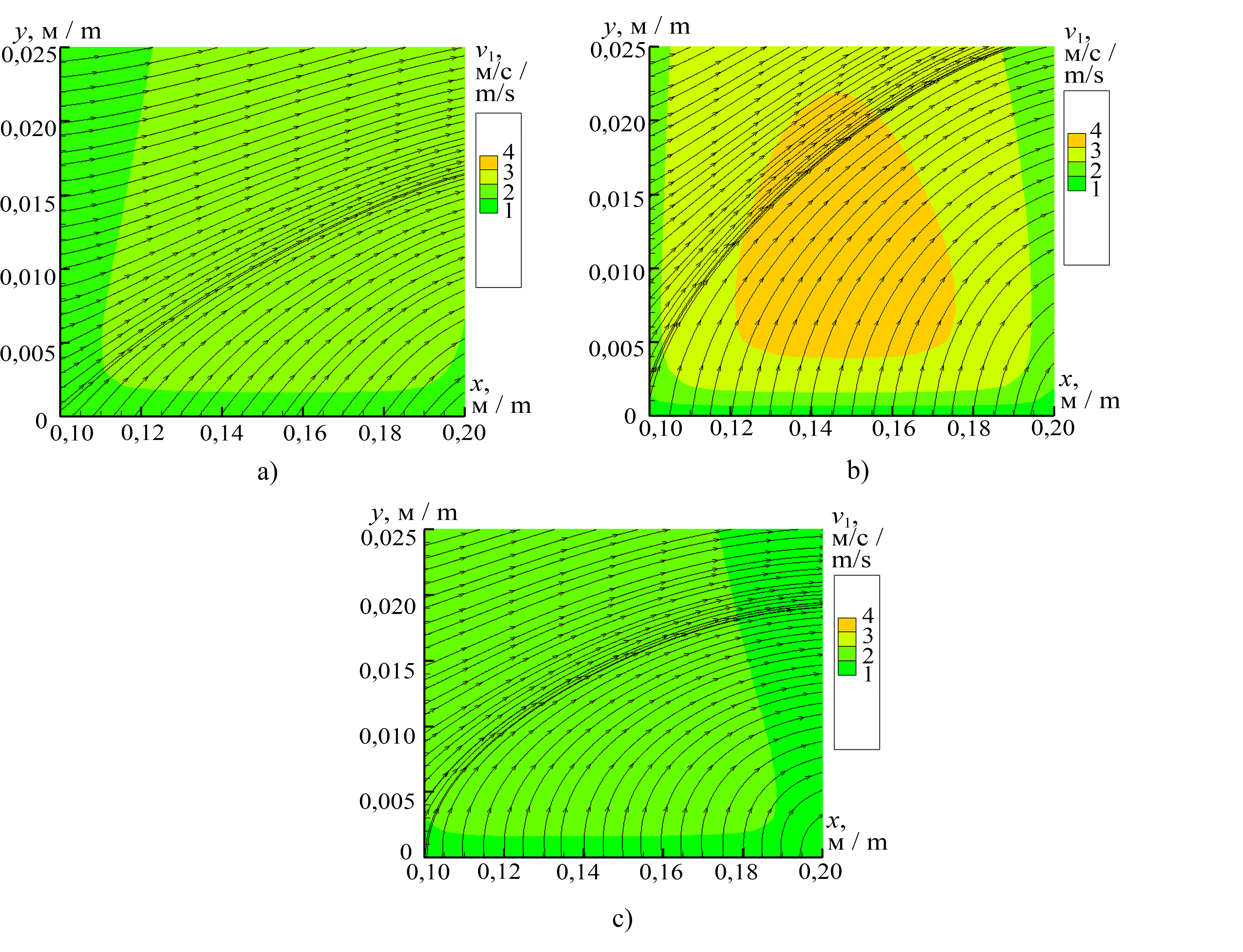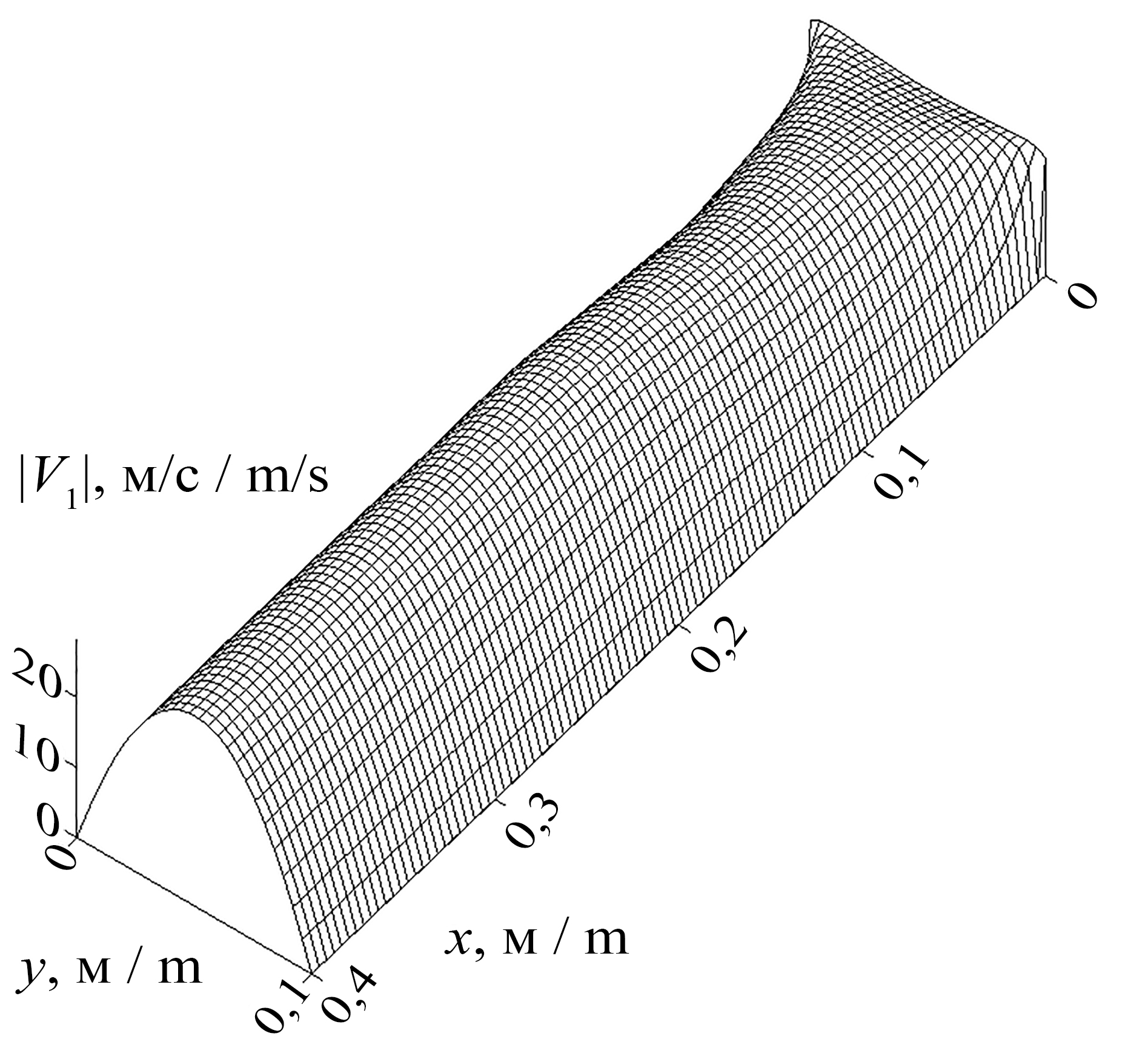 Note: |V1| is the velocity module of the carrier medium, м/с; x is the longitudinal coordinate, m; y is the transverse coordinate, m.