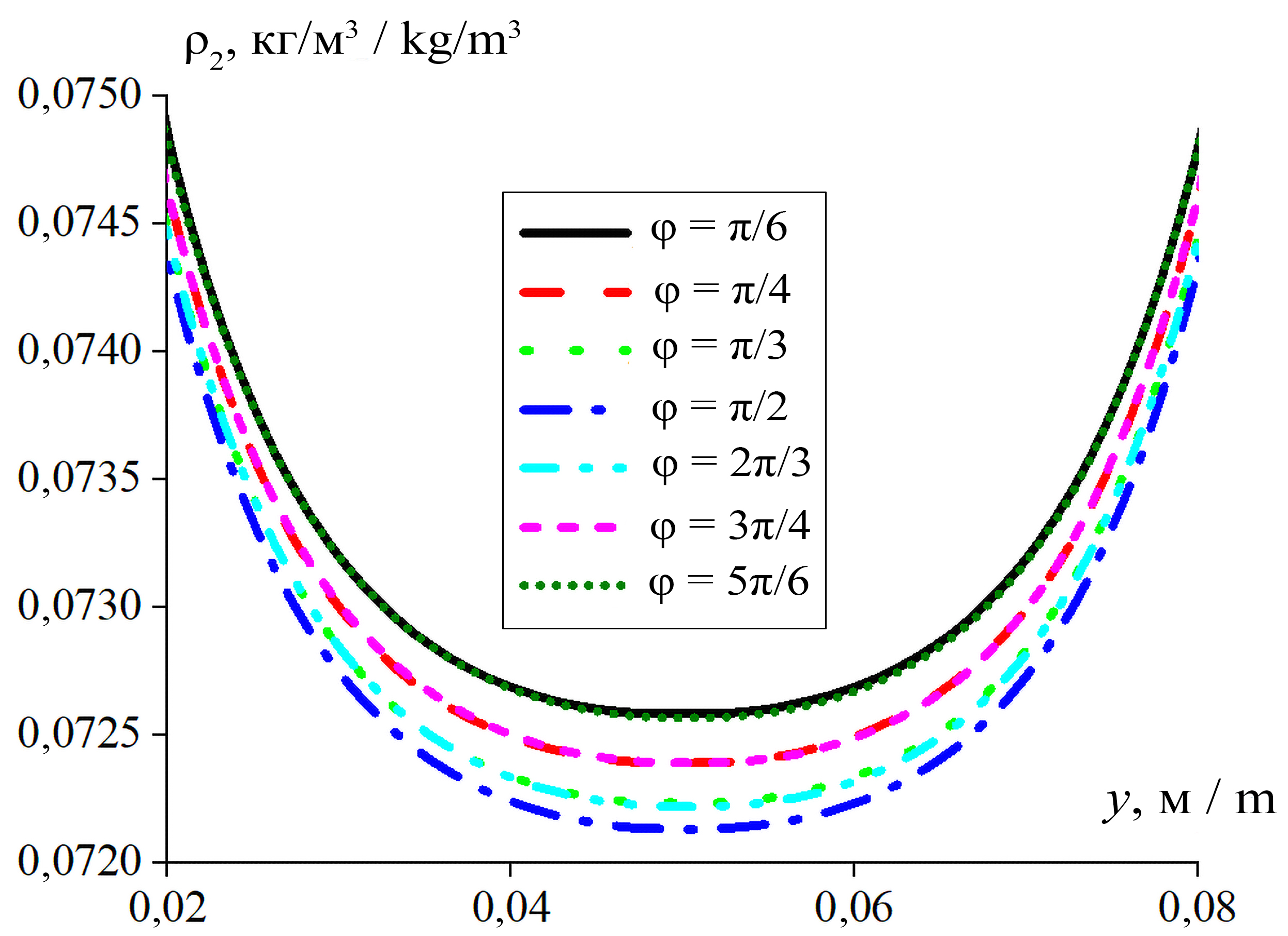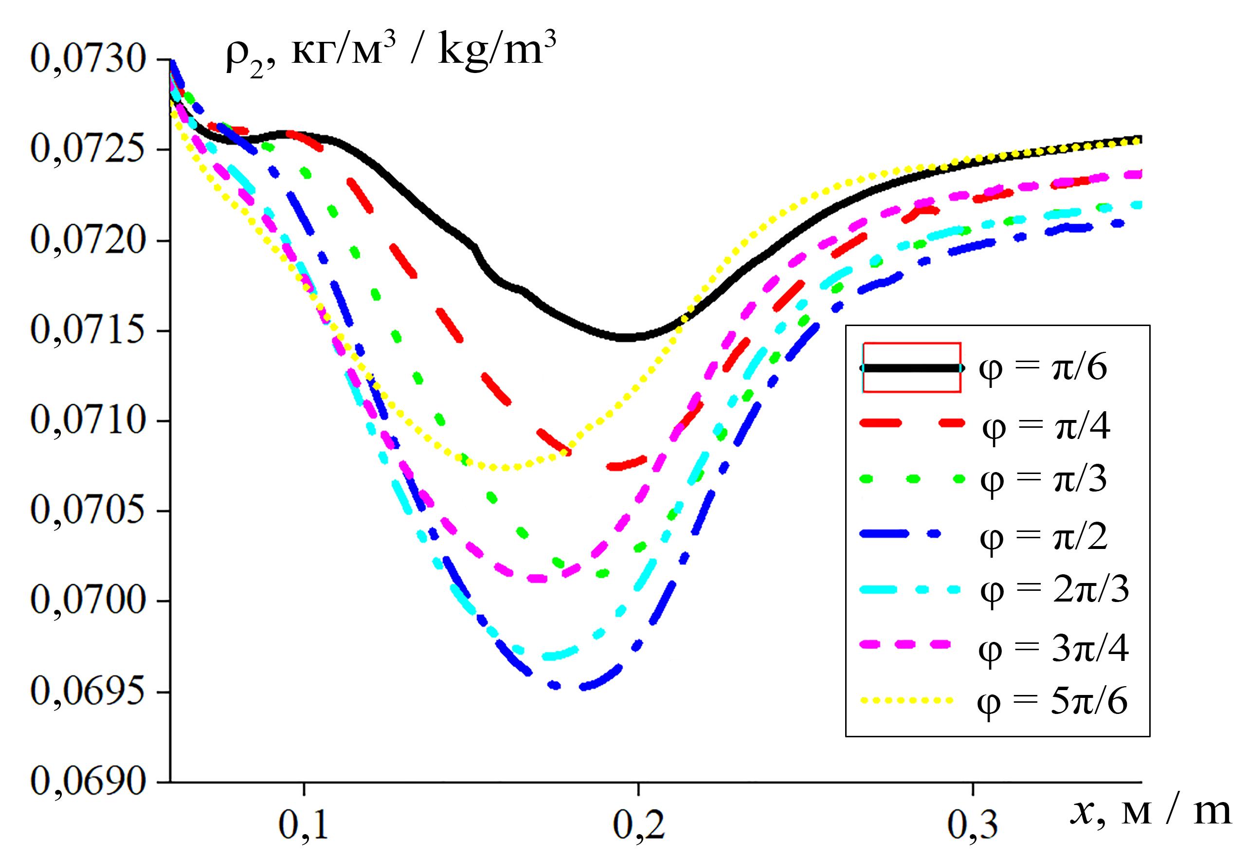 На рисунке 4 представлено пространственное распределение средней плотности пылевой фракции вдоль оси х (у = h/2), при различных углах вдува капельной фракции газовзвеси в поперечном распределении пылевой фракции. Наименьшее значение средней плотности достигается когда угол вдува составляет – φ = π/2: ρ2 = 0,0695 кг/м3. Для углов φ = π/6 и φ = 5π/6 величины средней плотности составляют – ρ2 = 0,0714 кг/м3, ρ2 = 0,0708 кг/м3 соответственно. Для углов φ = π/4 и φ = 3π/4 величины средней плотности составляют – ρ2 = 0,0707 кг/м3 и ρ2 = 0,0702 кг/м3 соответственно. Для углов φ = π/3 и φ = 5π/6 величины средней плотности составляют – ρ2 = 0,0701 кг/м3 и ρ2 = 0,0696 кг/м3 соответственно. При втекании капельных фракций против движения потока средняя плотность запыленной среды уменьшается более интенсивно.