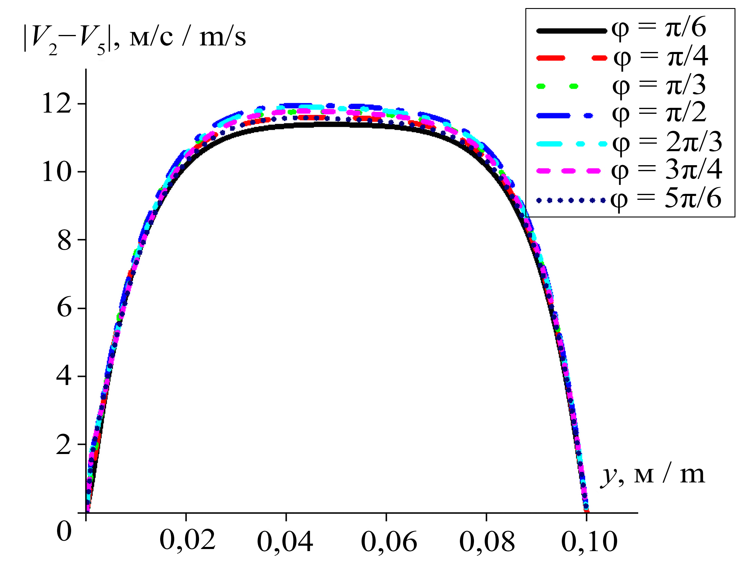 Поперечные распределения модуля разности скоростей для пылевой фракции и капельной фракции с диаметром дисперсных включений d4 = 20 мкм (рис. 8) демонстрирует, что наибольшее значение модуля разности скорости пылевой фракции и фракции частиц с дисперсностью d = 20 мкм достигается для угла вдува φ = π/2. При прочих углах втекания капельной фракции наблюдается меньшее значение скоростного скольжения.