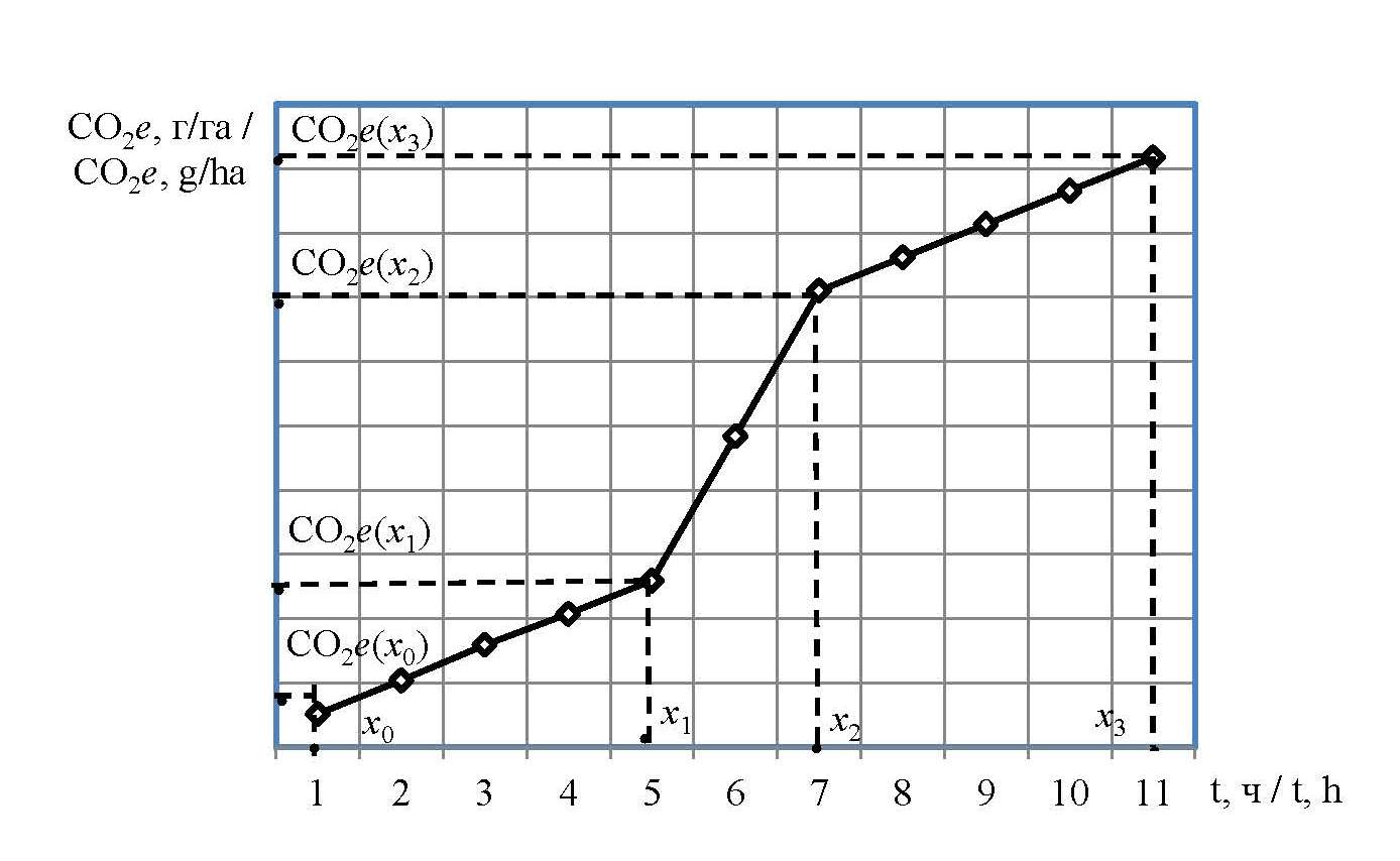 где x0 – значение аргумента, соответствующее началу измерений эмиссии до обработки почвы; x1–значение аргумента, соответствующее началу проведения технологической операции интенсивному выбросу из почвы; x2 – значение аргумента, соответствующее окончанию интенсивного выброса из почвы; x3 – значение аргумента, соответствующее началу последующей технологической операции; CO2e(x0 ) – выбросы углекислого газа в начале измерений до обработки почвы, г·ч/га; CO2e(x1 ) – выбросы углекислого газа в начале проведения технологической операции, г·ч/га; CO2e(x2 ) – выбросы углекислого газа, соответствующие окончанию интенсивности от проведения операции, г·ч/га; CO2e(x3 ) –выбросы углекислого газа в начале последующей операции, г·ч/га.