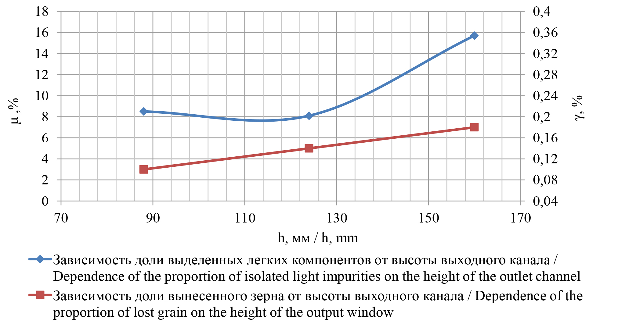 Высота выходного окна h, мм / Height of the outlet channel h, mm | Доля выделенных легких компонентов вороха, μ, % / Proportion of isolated light impurities, μ, % | Доля вынесенного зерна γ, % / Рroportion of lost grain γ, % |