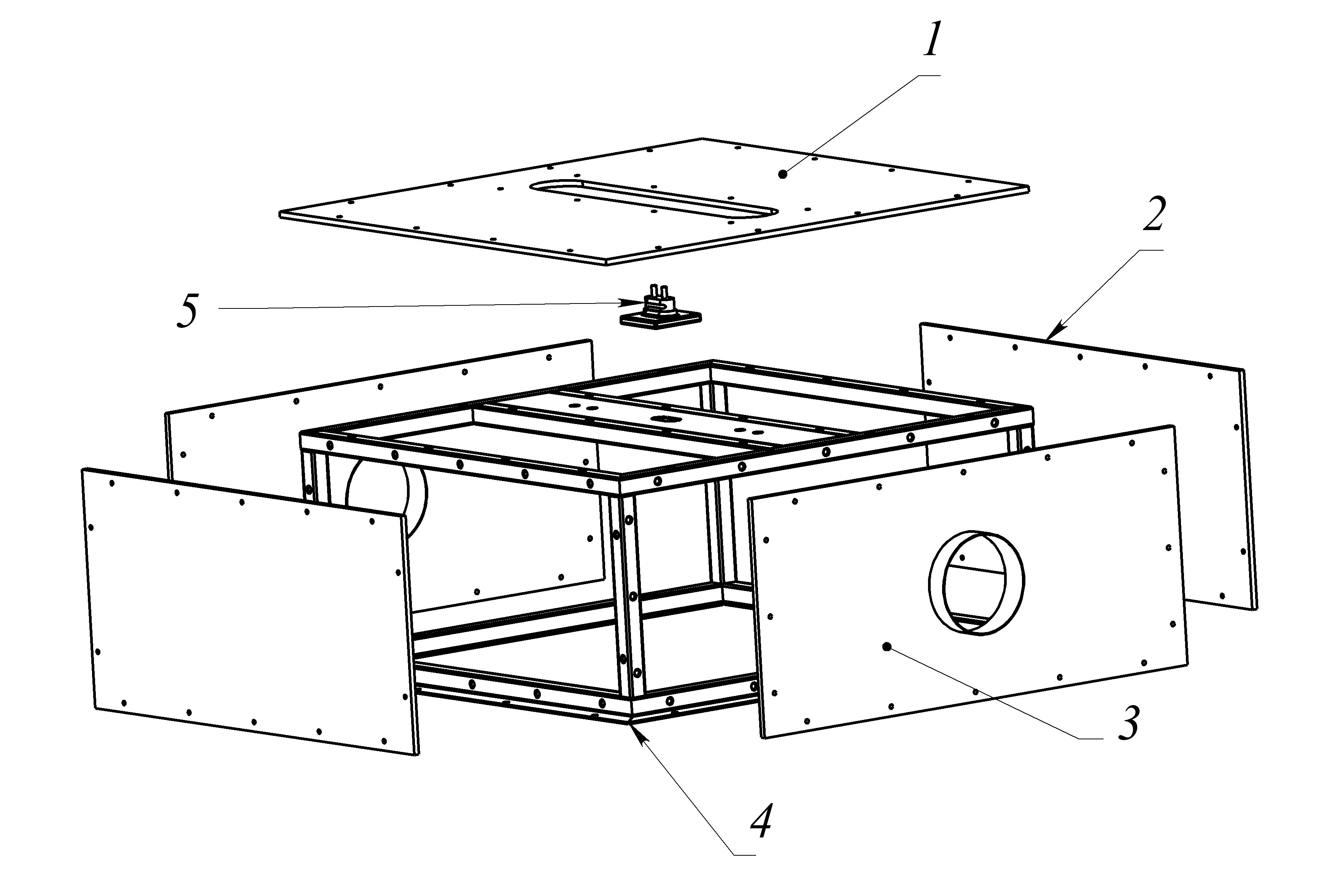 1 – верхняя стенка; 2 – боковая стенка; 3 – боковая стенка с фланцем; 4 – каркас; 5 – лампа