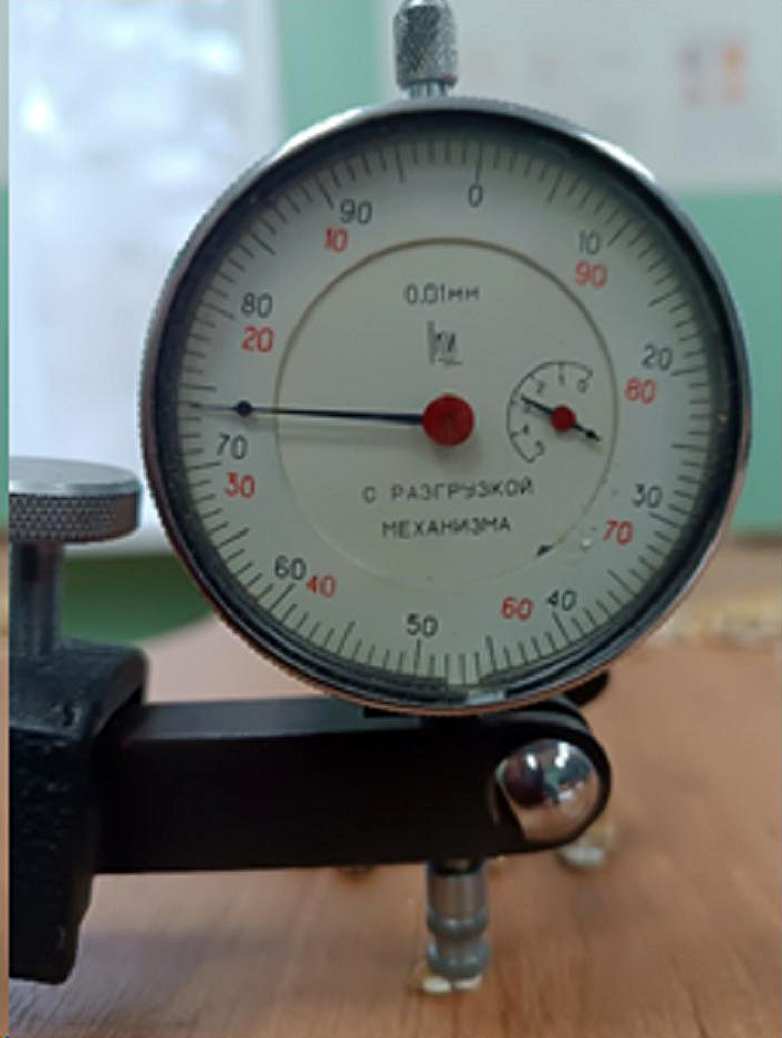 Микронизация зерна осуществлялась коротковолновым источником инфракрасного излучения типа QHL мощностью 1 500 Вт. После микронизации зерна, нагрев которых ввиду неоднородности теплового поля был недостаточен для внутренних изменений, отделялись на семяочистительной машине СМ 0,15. Для определения толщины хлопьевидной фракции применялся абсолютный метод измерения, согласно которому индикаторная головка часового типа ИЧ-05 0,01 с плоским измерительным наконечником устанавливалась на плоскую поверхность с предварительным натягом 1 мм, после чего указатель шкалы головки приводился в нулевое положение. Для измерения толщины зерновки наконечник отводился от поверхности, под него помещалась зерновка, наконечник отпускался и производилось измерение толщины путем считывания показаний непосредственно со шкалы прибора (рис. 1).