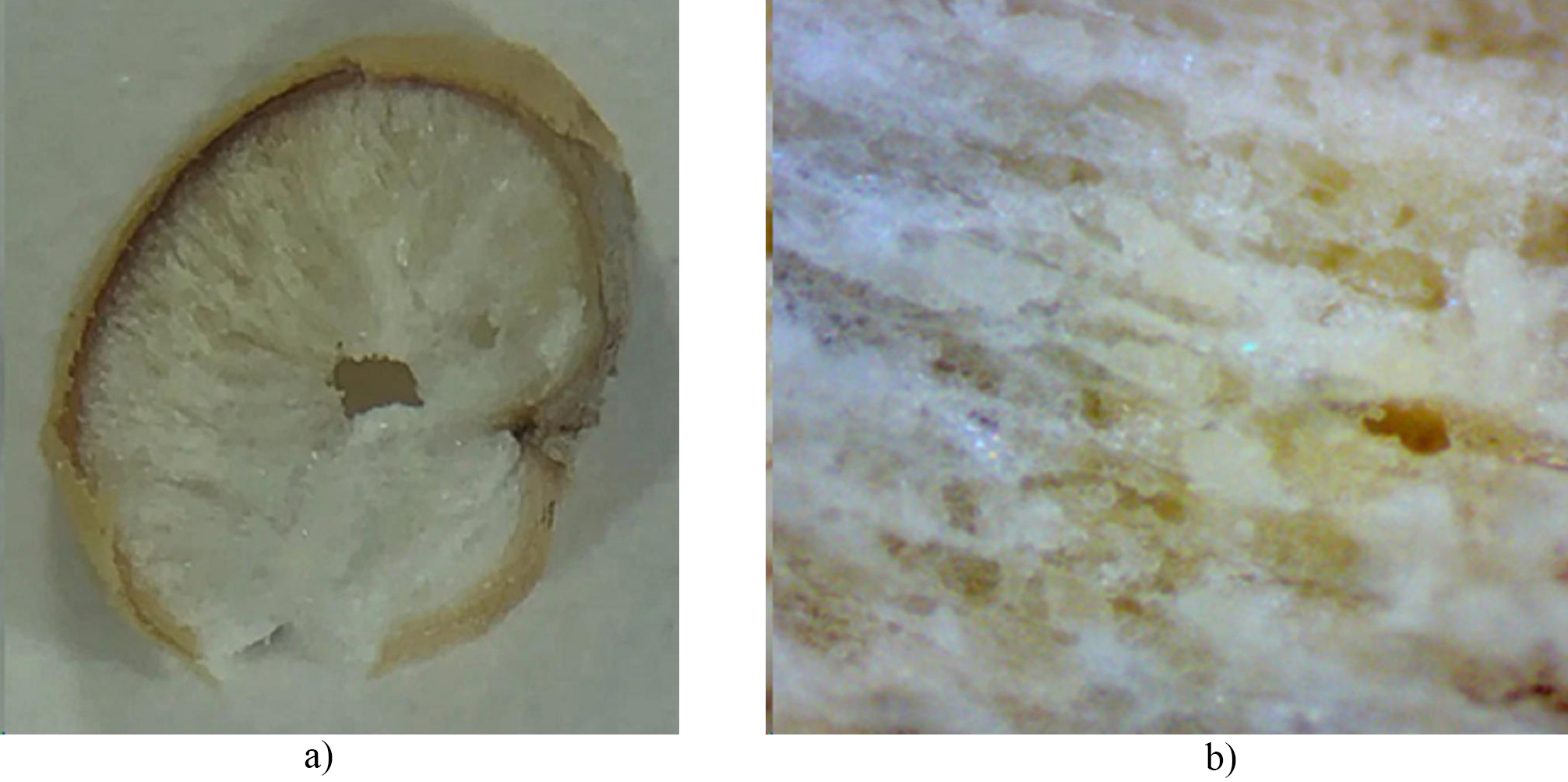 Рис. 2. Внутреннее строение зерновки после микронизации: a) поперечный разрез; b) проявление капиллярного строения