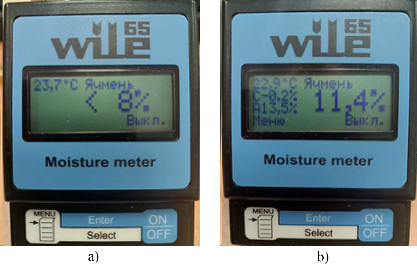 Fig. 3. The examples of measuring moisture with the moisture meter Wile-65: a) micronized grain; b) non-micronized grain