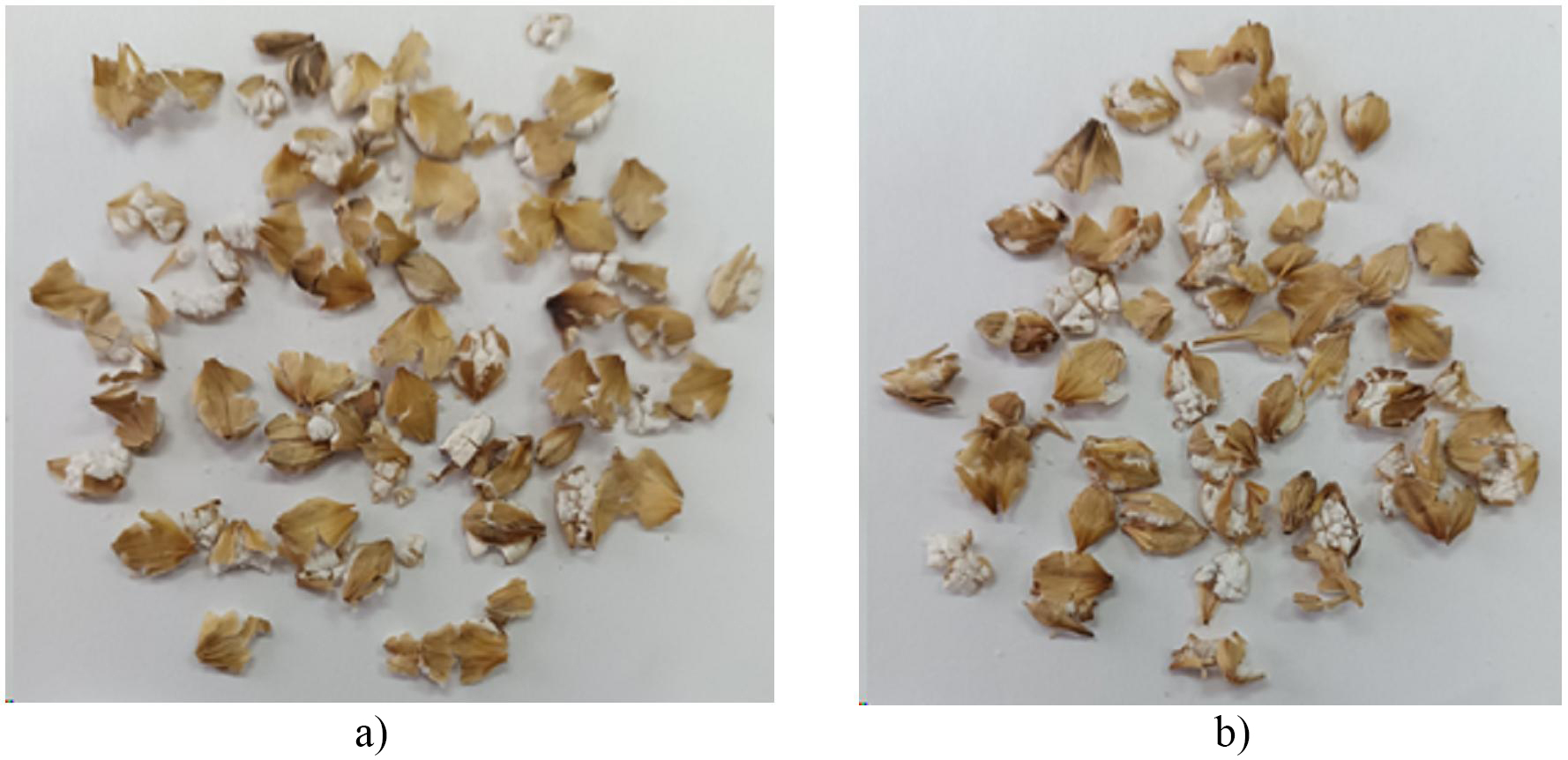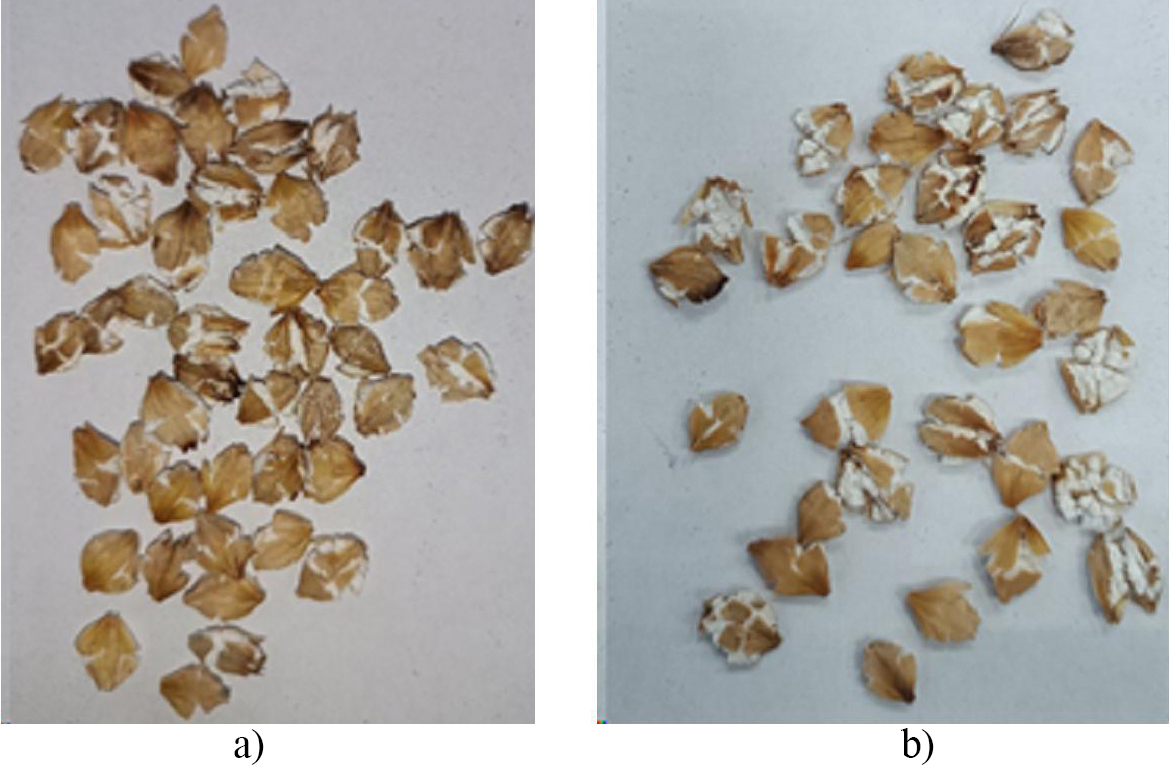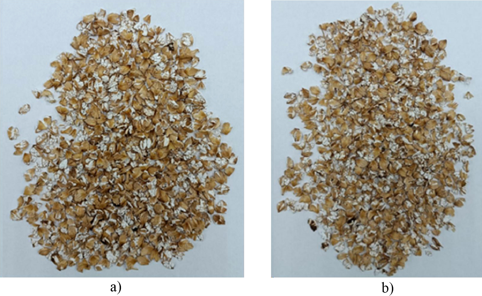 Fig. 10. The results of the flattening non-micronized grain, clearance gap 0.7 mm, n = 300 r/min: a) dry; b) moistened