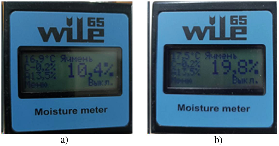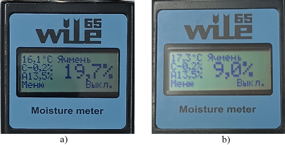 Рис. 3. Примеры измерения влажности влагомером модели Wile-65: a) микронизированное зерно; b) немикронизированное зерно