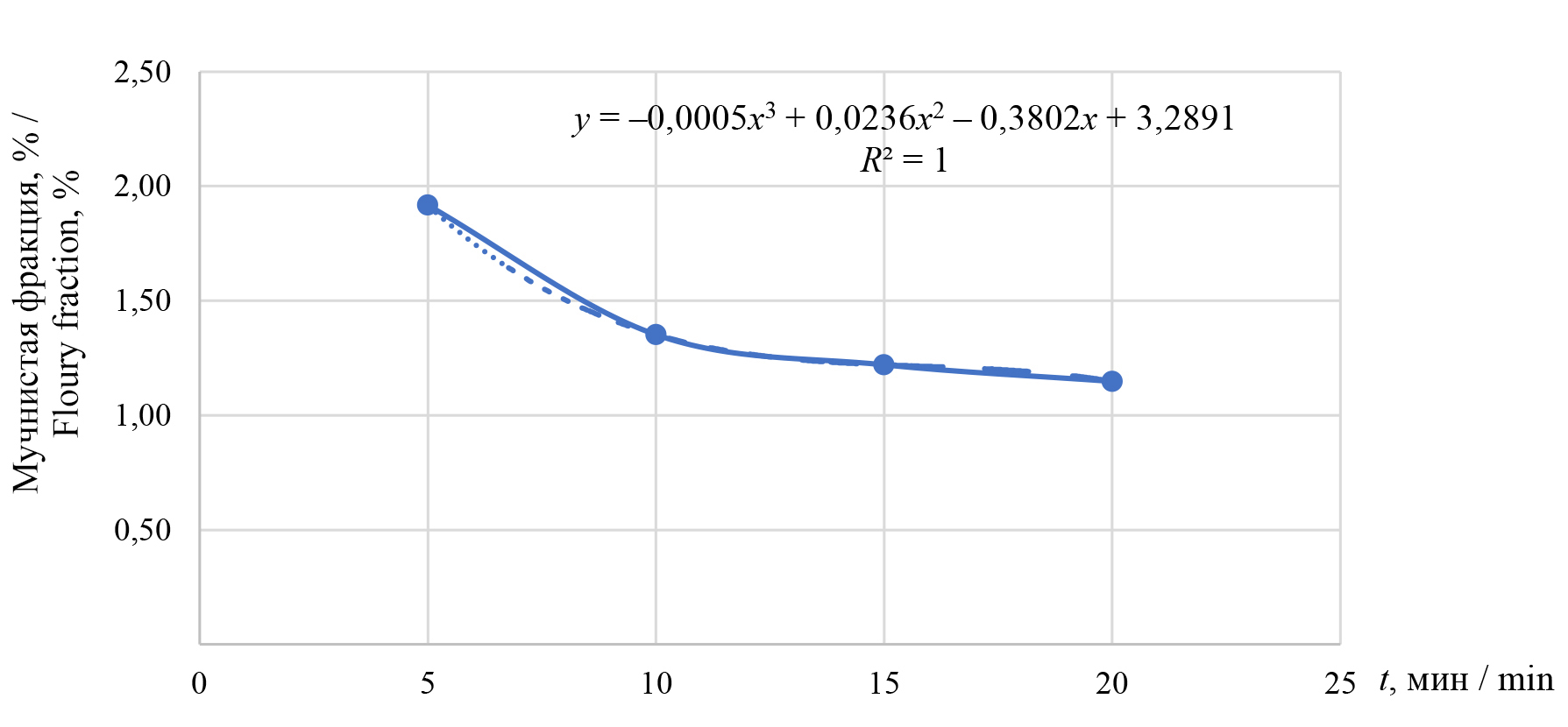 В ходе проведенных исследований по оценке влияния увлажнения на количество мучной фракции выдвинута рабочая гипотеза: продолжительность увлажнения окажет влияние на результаты рассева плющеного зерна. Для изучения высказанного предположения проведена серия экспериментов, в ходе которых изменялась продолжительность увлажнения зерновок: время увлажнения составило 5, 10, 15 и 20 мин. В результате исследований получена зависимость влияния продолжительности увлажнения на количество мучной фракции (рис. 9), с высокой точностью аппроксимируемая полиномом 3-й степени.