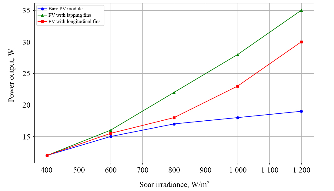 Figure 10 shows a comparison of the power output of solar modules under various cooling technologies. The standard module (blue) can generate approximately 15 W at 400 W/m² and 30 W at 1 200 W/m². The module with overlap blades (green) generates 20 W at 400 W/m² and 35 W at 1 200 W/m². The longitudinal blades (red) produce 18 W and 34 W at 1 200 W/m² respectively. These results suggest that cooling technologies improve the practicability of power generation utilizing solar irradiance, especially at higher intensities.