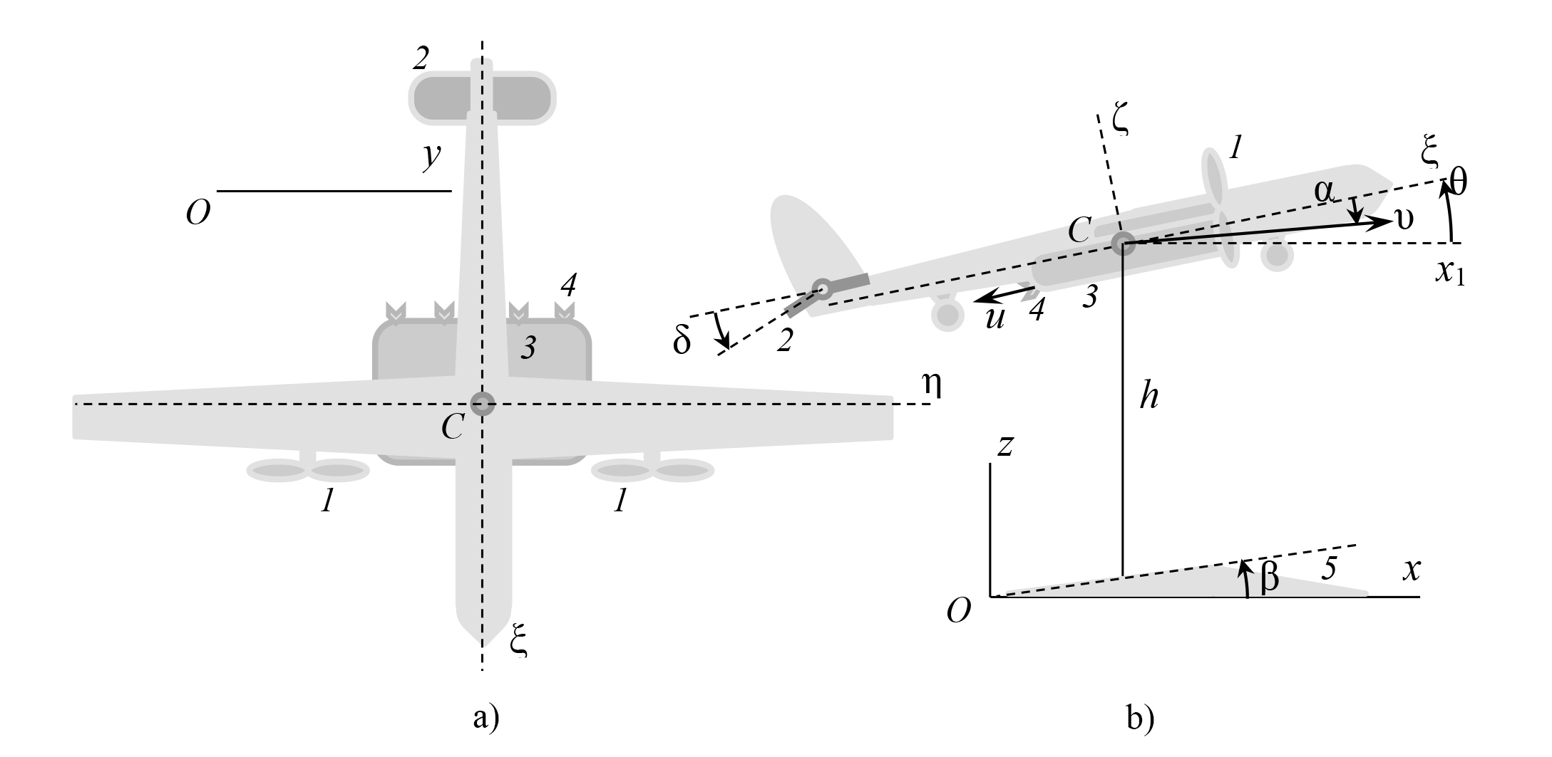 F i g. 1. Scheme of a small unmanned aerial vehicle in longitudinal flight without roll: a) viewed from above; b) from the side: