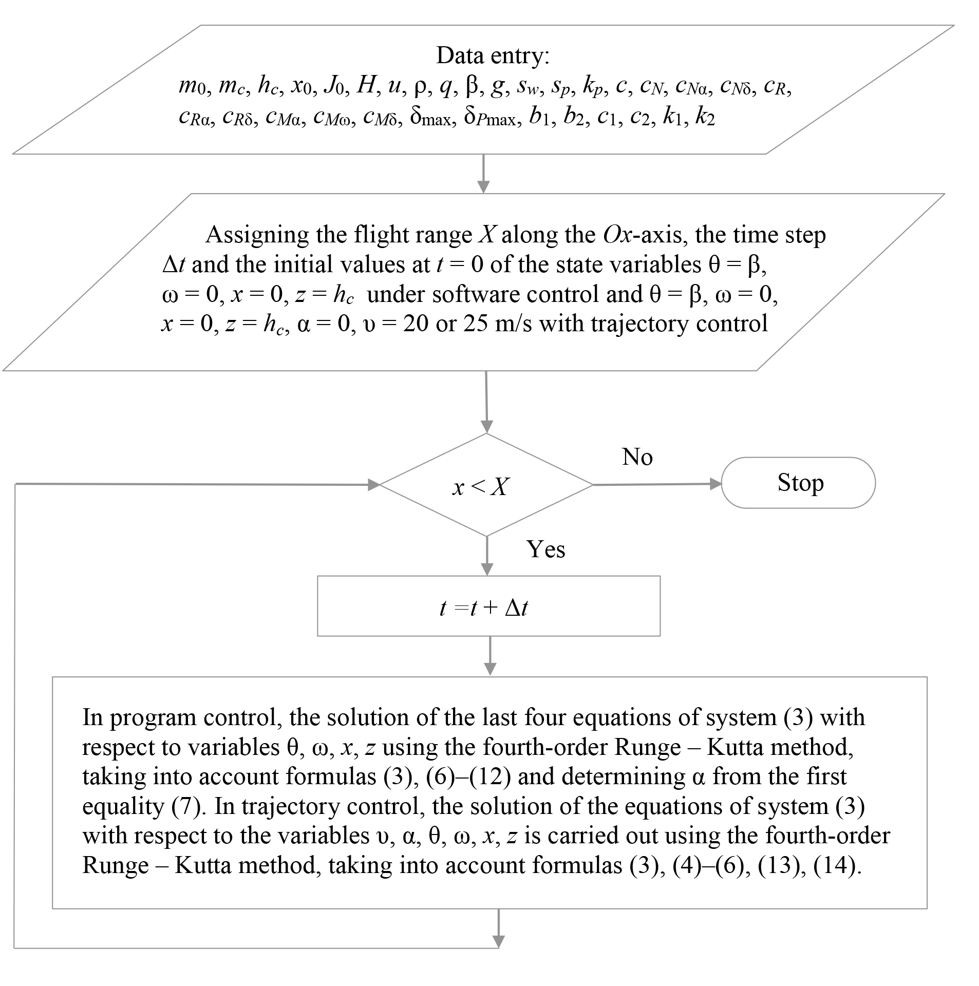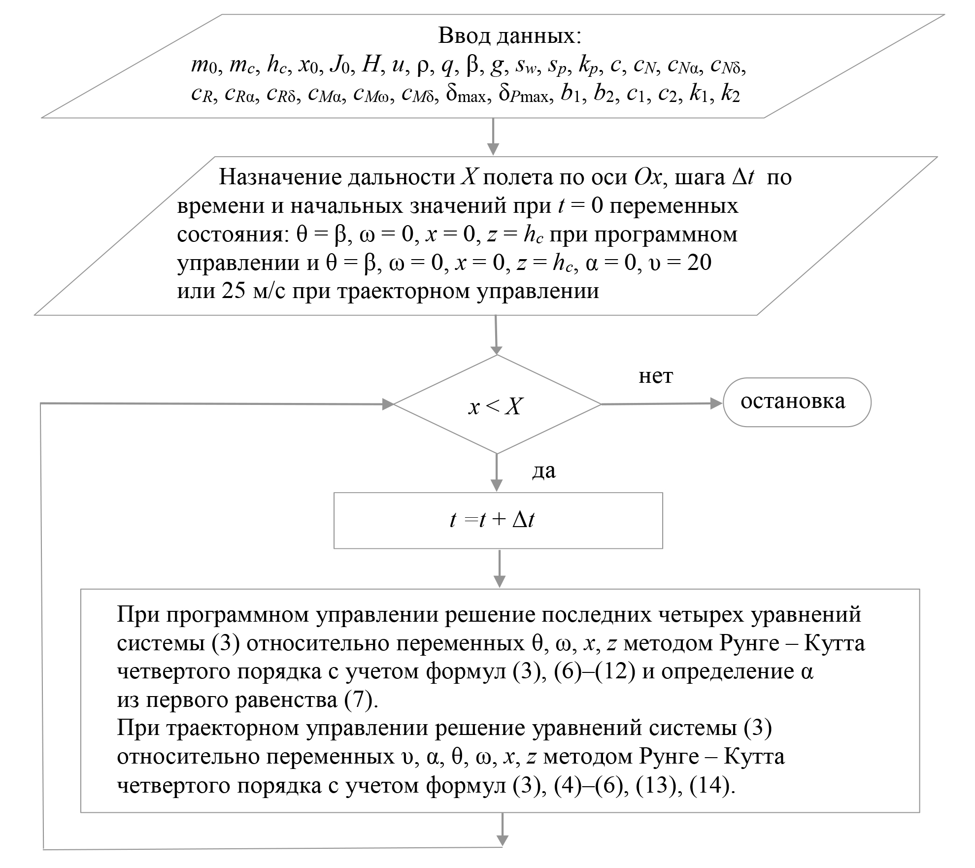 Система алгебро-дифференциальных уравнений (3), (7) с учетом (4), (5) состоит из восьми уравнений и позволяет найти шесть переменных состояния и две переменные управления, которые служат программным управлением. Она приводится к линейной системе четырех обыкновенных дифференциальных уравнений с переменными θ, ω, x, z при заданной постоянной скорости υc. Действительно, из первого уравнения системы (3) с учетом выражения для R из (5) следует такое равенство: