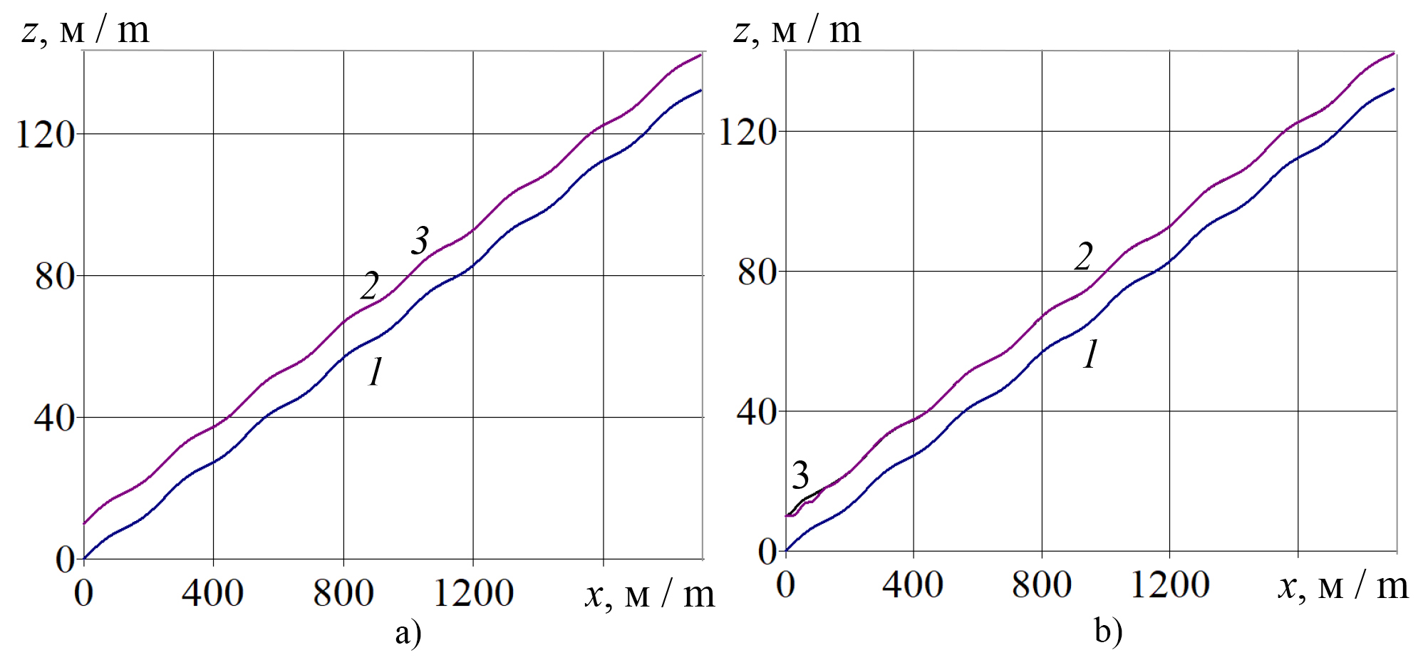 Р и с. 5. Зависимости от координаты x координаты z (высоты над уровнем моря) точек линии волнистого профиля поля 1 и центра масс малого беспилотного летательного аппарата при программном (а) и траекторном (b) управлении при полете с заданной скоростью: