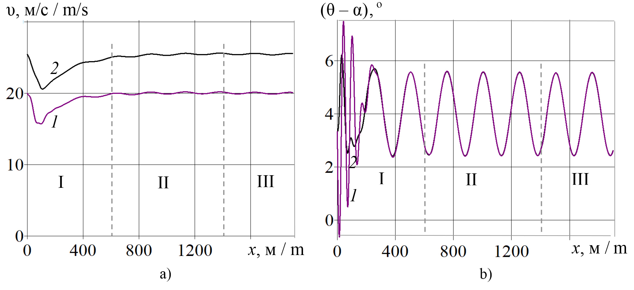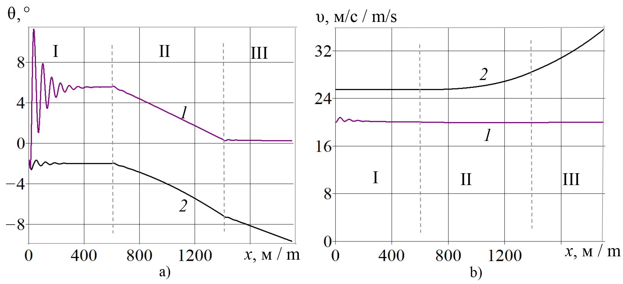 Р и с. 9. Зависимости угла тангажа (а) и скорости (b) от перемещения x центра масс малого беспилотного летательного аппарата при траекторном управлении полетом над полем с прямым профилем под углом к горизонтальной плоскости 2° при заданной скорости: