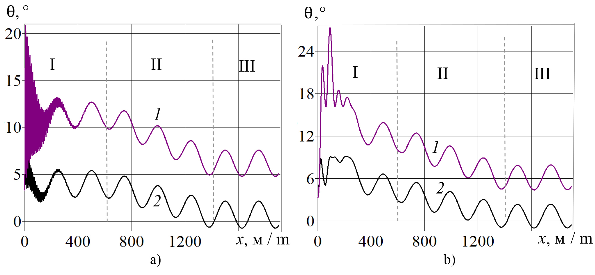 Р и с. 8. Зависимости угла тангажа θ от перемещения x центра масс малого беспилотного летательного аппарата при программном управлении (а) и траекторном управлении (b) полетом над полем с волнистым наклонным профилем со скоростью: