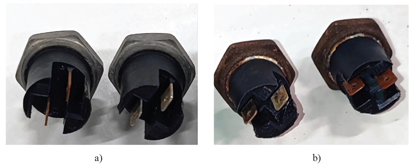 В качестве объекта исследования, предназначенного для изучения воздействия солевого тумана на коррозию узлов сельскохозяйственной техники, были выбраны выключатели света заднего хода. Такой выбор обусловлен широкой распространенностью этих компонентов в различных марках и моделях комбайнов, выпускаемых разными производителями. Выключатели света заднего хода применяются не только в комбайностроении, но и в тракторной, автомобильной, судостроительной и других отраслях промышленности. Согласно информации, предоставленной производителем машиностроительной продукции, основной причиной отказа выключателей света заднего хода является окисление контактов и залипание подвижных элементов. В рамках данного исследования рассматривались два типа выключателей, различающихся материалом контактных элементов. Первый тип (М) был оснащен медными контактами, которые демонстрируют достаточно высокую электропроводность, однако подвержены окислению с образованием различных химических отложений, особенно при эксплуатации в условиях повышенной влажности. Такие выключатели рекомендуются для применения в стабильных сухих условиях, например, в сельскохозяйственной технике, работающей в засушливых регионах [19; 20]. Второй тип выключателей (МС) имел посеребренные медные контакты, сочетающие преимущества меди с дополнительными защитными свойствами серебряного покрытия, благодаря которому достигается повышение электропроводности и коррозионной стойкости контактной группы при эксплуатации в агрессивных средах. Несмотря на увеличенную стоимость, данный тип выключателей является предпочтительным выбором для техники, эксплуатирующейся в условиях повышенной влажности, химического загрязнения или значительных температурных колебаний, включая зерноуборочные комбайны и морское оборудование [19; 20; 42]. Преждевременный выход из строя данного узла, по данным производителя, обусловлен несоответствием фактического срока службы паспортным характеристикам изделия. Объем экспериментальной выборки насчитывал по 50 образцов каждой категории. Общий вид выключателей заднего хода С-исполнения с медными клеммами представлен на рисунке 1 до воздействия и после.