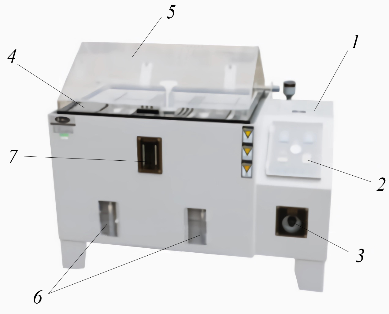 Представленный на рисунке 2 испытательный стенд состоит из емкости ввода испытательного раствора 1, куда загружается испытательный раствор, в котором автоматически происходит распределение солевого раствора в отверстии для предварительного нагрева. С фронтальной стороны находится панель управления 2 с сигнализатором, сообщающим об ошибке или завершении испытания, и регулировочный клапан 3 необходимого давления (по умолчанию 1,00 ± 0,01 кгс/см2). Кроме основной испытательной камеры 4, находящейся под крышкой 5, также имеется отверстие корпуса управления, датчики температуры и влажности в камере 7 и мерные цилиндры 6 для определения объема раствора в камере.