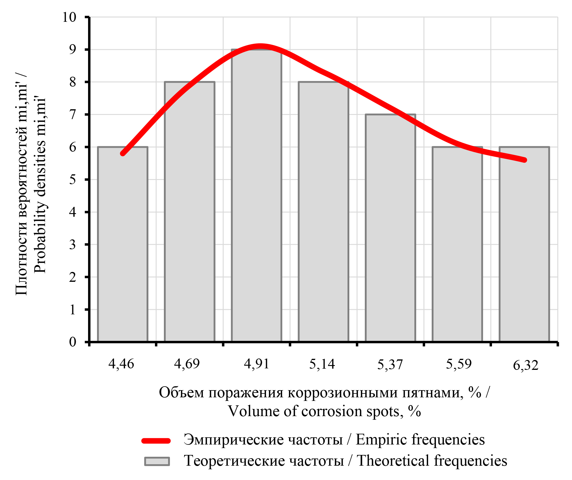Рис. 4. Распределение плотности вероятностей эмпирических и теоретических частот выборки в соответствии с законом Вейбулла