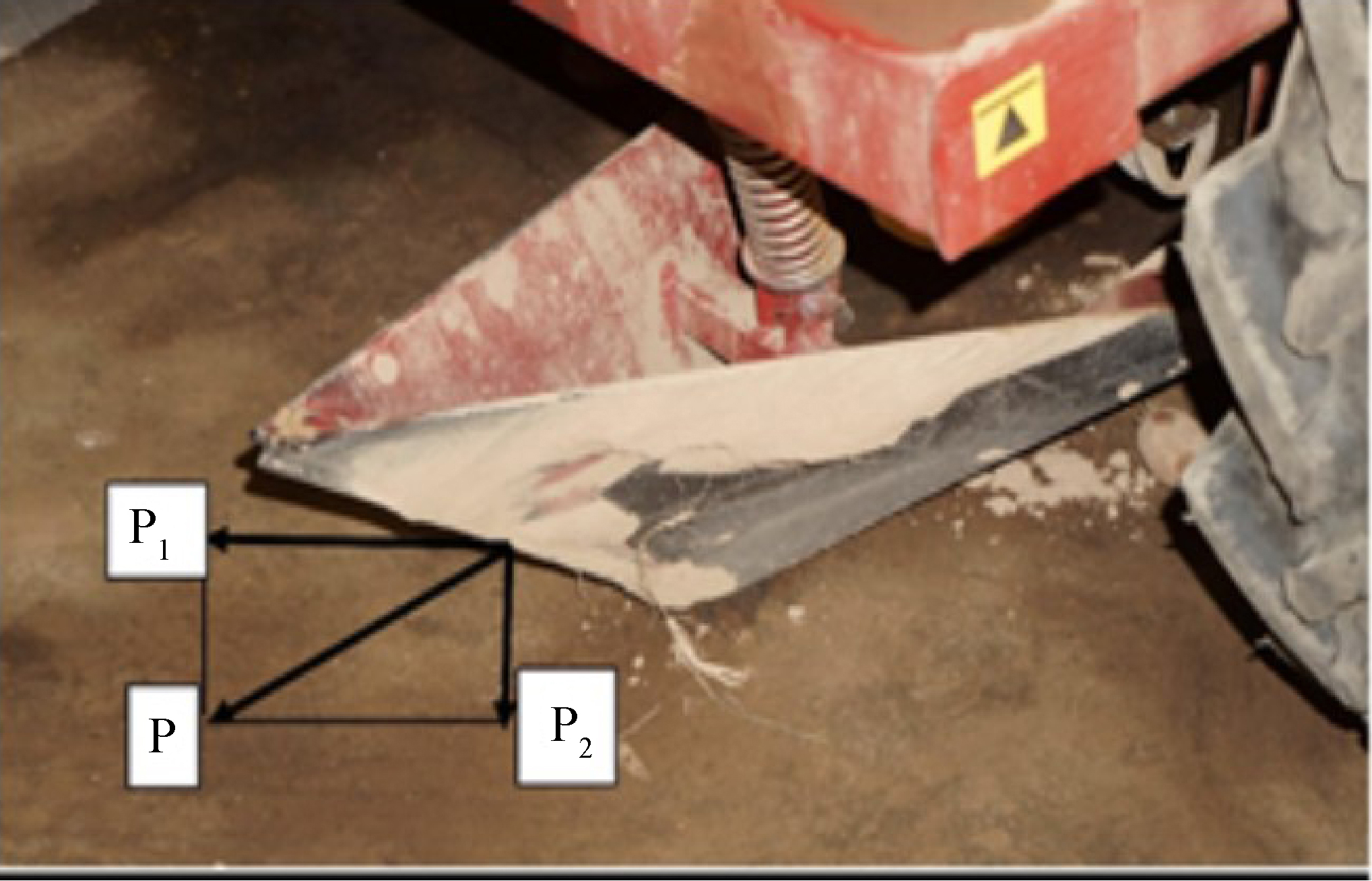 Рис. 6. Сошник с тупым углом вхождения в почву картофелесажалки Л-202: P1 – тяговая сила от трактора; P2 – сила от действия веса сажалки; P – результирующая сила
