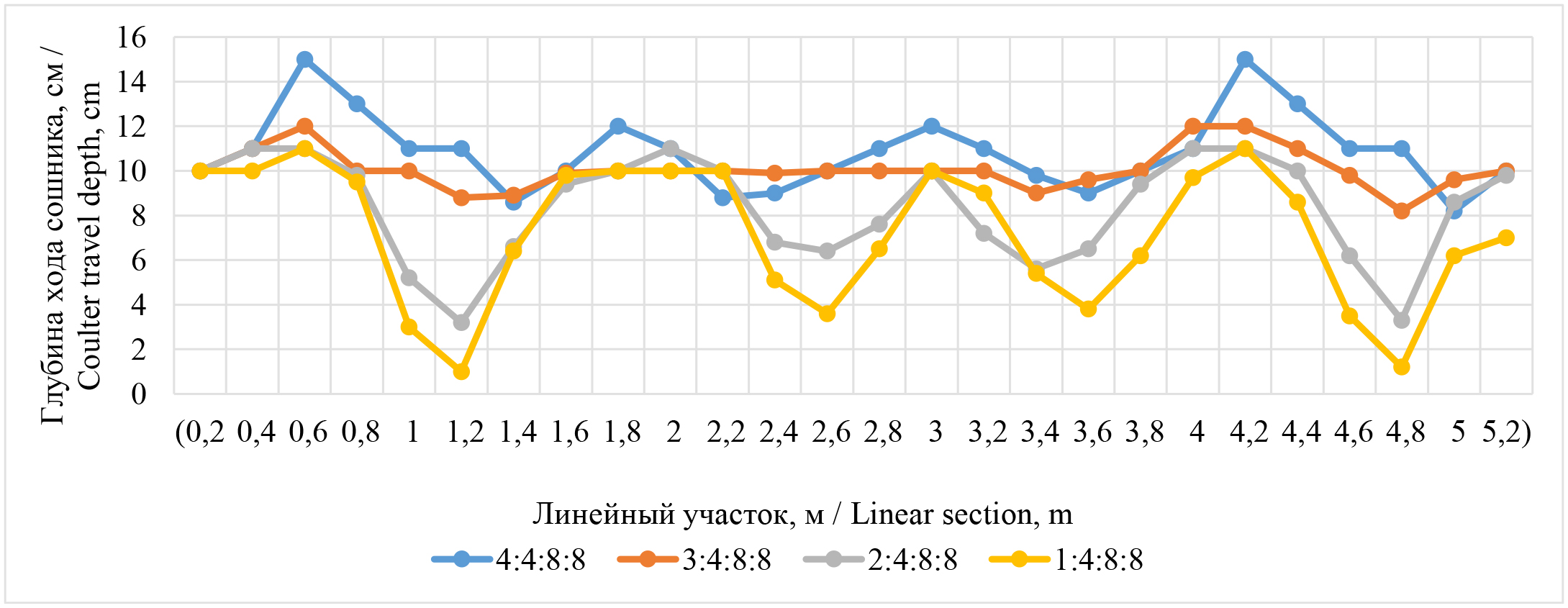 У сошниковой группы с соотношением сторон подвески 150:200:400:400 отклонения глубины хода от заданной не превышают 2 см даже при неровностях поля 20 см, при этом средняя глубина хода сошника остается на уровне заданной.