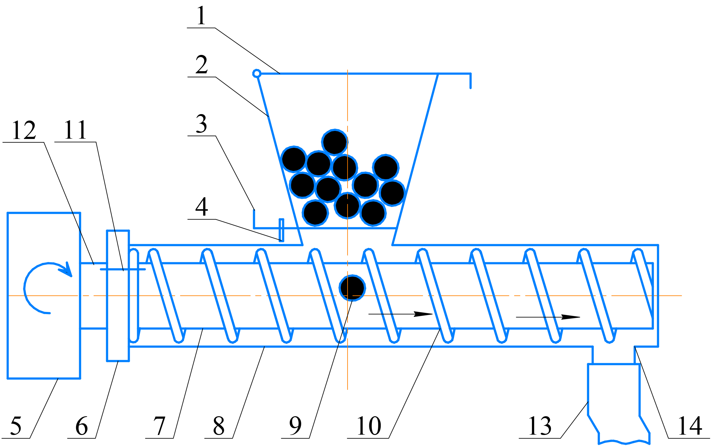 Рис. 3. Спирально-винтовой высевающий аппарат: 1 ‒ крышка; 2 ‒ загрузочный бункер; 3 ‒ дозатор; 4 ‒ фиксатор; 5 ‒ приводное устройство; 6 ‒ диск; 7 ‒ внутренняя трубка; 8 ‒ корпус; 9 ‒ семенной материал; 10 ‒ рабочий орган; 11 ‒ болтовое соединение; 12 ‒ вал; 13 ‒ гибкая трубка; 14 ‒ выходное окно