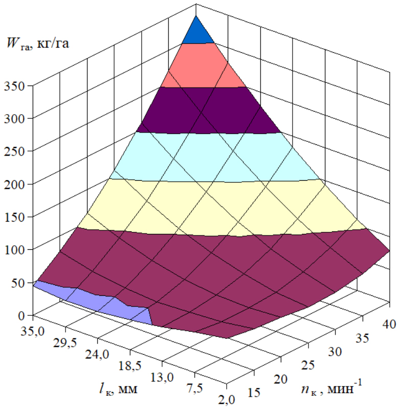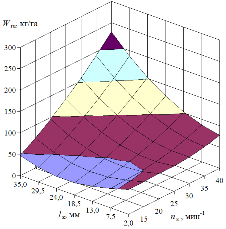 Fig. 11. Model of the dependence of the rates of seeding vetch by the roller feed unit on the rotation frequency and the roller operating length