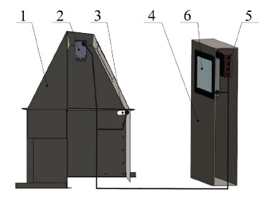 Для анализа работы графического интерфейса создана лабораторная установка системы технического зрения, которая включала в себя: фотомодуль, состоящий из механического защищенного корпуса 1 с видеокамерой 2 и структурированной подсветкой 3, защищенного электрического шкафа 4 с вычислительным модулем 5 и сенсорной панелью управления 6 (рис. 1).