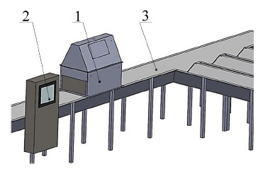 1 – оптический модуль с видеокамерой и структурной подсветкой; 2 – электронный блок управления; 3 – конвейер;