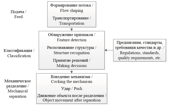 Подачу плодов можно представить, как формирование потока и транспортирование, классификацию – как обнаружение признаков, распознавание структуры и принятие решений на основе заложенных в «память» предписаний, а процесс механизированного разделения – как подпроцессы взвода исполнительного механизма, удара и последующего движения объекта (рис. 3).