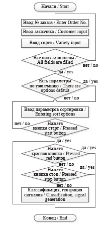 В представленной схеме первые три этапа предусматривают ввод информации о предстоящей работе: номер заказа, заказчик, сорт плодов. Эта информация необходима для формирования отчета о результатах проделанной работы.