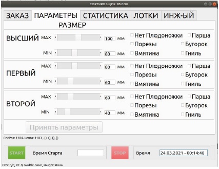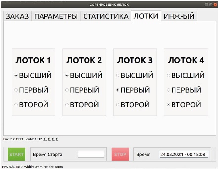 - Графический интерфейс пользователя системы технического зрения содержит все необходимые инструменты («Заказ», «Параметры», «Статистика», «Лотки» и «Инженерный») для управления и оптимизации затрат при сортировке яблок на три товарных сорта.