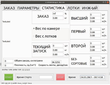 Анализ получаемой информации оператором из вкладки «Статистика» (рис. 8) графического меню позволяет определить, сколько плодов каждого сорта получается. Последняя информация необходима оператору для принятия решения о выделении дополнительного выходного транспортера для сорта, на котором объем поступающих отсортированных плодов значительно больше других (рис. 7).