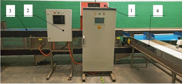 and structural illumination; 2 – electronic control unit; 3 – conveyor; 4 – output conveyor for sorted fruits