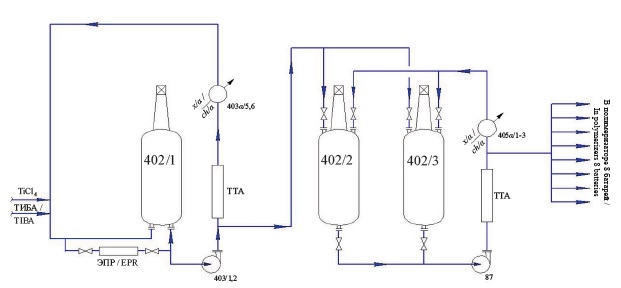 Непрерывный процесс получения полиизопрена в присутствии титанового катализатора предполагает использование всего двух реакторов каскада, а суспензию каталитического комплекса при этом получают при −10 ºC путем сливания толуольных растворов TiCl4 (катализатор) с Al(i − C4H9)3 (сокатализатор), p-электродонорной добавкой дифенилоксида (ДФО) и -электродонорной добавкой пиперилена.