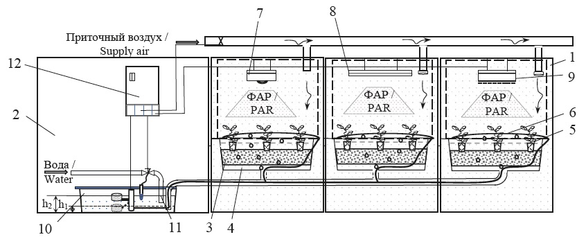 За определенный период во время выращивания часть питательного раствора усваивается растениями в горшках 5 и испаряется, после чего вода из доливочного трубопровода 11 дополняет емкость для питательного раствора 10. Регулярно после добавления поливочной воды с помощью pH-метра вручную осуществляется контроль уровня кислотности питательного раствора и поддержание его на уровне 5,5‒6,5, а с помощью кондуктометра поддерживается уровень проводимости 1,85‒1,89 мСм/см. Использовались удобрения Advancer Nutrients pH Perfect Bloom, pH Perfect Grow, pH Perfect Micro, которые заливались в емкость для питательного раствора 10 в равных пропорциях в среднем по 5‒10 мл каждого на 1 литр воды. Весь цикл работы оборудования контролируется и регулируется с щита управления 12. На 35-е сутки производится уборка урожая.