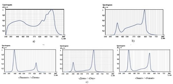 Согласно нормам искусственного освещения [8] для выращивания зеленных культур в условиях светокультуры растений, предлагаются технологии облучения, где предпочтительно использовать базовый спектр излучения, определяемый отношением синей (с), зеленой (з) и красной (к) областей в полном потоке фотонов фотосинтетически активной радиации (ФАР), %: 20 (с) ‒ 0 (з) ‒ 80 (к). Эффективный для растений и благоприятный для зрения персонала спектр с излучением в тех же областях ФАР, %: 20 (с) ‒ 18 (з) ‒ 62 (к). Спектр излучения в области ФАР стандартного источника D65 Международной комиссии по освещению (дневной свет с пропорциональным распределением энергии в синей, зеленой и красной зонах спектра), %: 30 (с) ‒ 36 (з) ‒ 34 (к). Изложенные технологии базируются на исследованиях, проводимых в Национальном исследовательском университете «МЭИ» [9; 10].