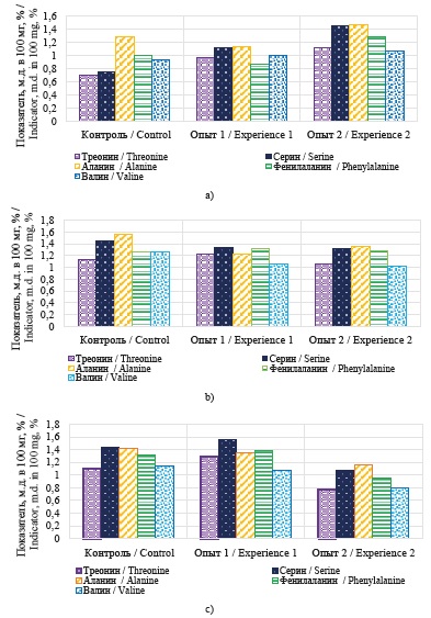 Несколько иную закономерность показывает содержание фенилаланина, влияющего на работу центральной нервной системы и участвующего в синтезе белков: снижается по сравнению c контролем в первом опыте К − на 13 %, увеличивается Х − на 9 %, А − на 6 %. Во втором опыте: рост содержания фенилаланина К − на 30 %, снижение Х − на 2 %, А − на 28 %.