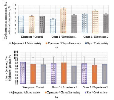 a) sublimated moisture, %; b) moisture in greens, %