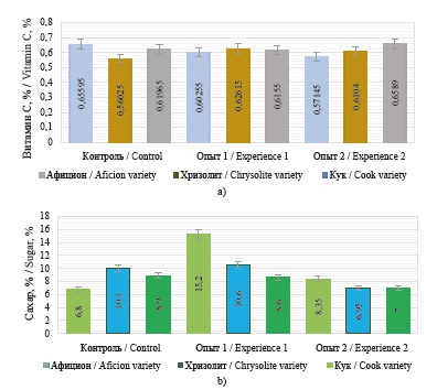 Fig. 5. Content in the studied samples: a) vitamin C, %; b) sugar, %