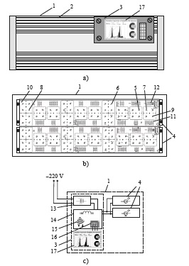 a) top view; b) bottom view; c) scheme of design interconnections 1 – housing; 2 – irradiator; 3 – power supply and control unit;