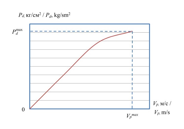 где b = T ‒ угловой коэффициент, равный значению твердости почвы на обрабатываемом агрофоне; x = Vp ‒ аргумент функции (6); ‒ максимальное значение скорости напора (или динамического давления (рис. 3), кг/см2; ‒ максимальное значение скорости перемещения рабочего органа (рис. 3), м/с.