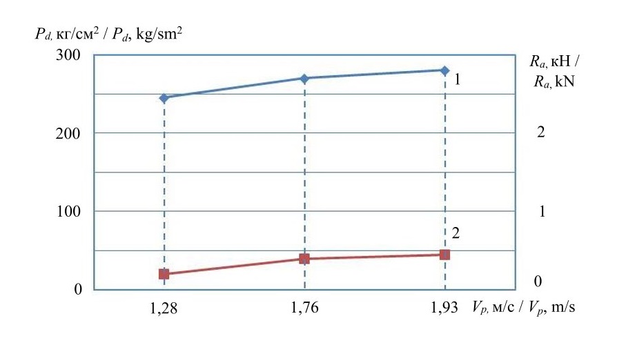 Анализ полученных результатов исследований показывал, что с повышением скорости перемещения рабочего органа от 1,28 до 1,93 м/с скорость напора Pd на рабочий орган увеличивается с 247 до 276 кг/см2, при этом тяговое сопротивление рабочего органа Ra возрастает от 2,47 до 2,7 кН.
