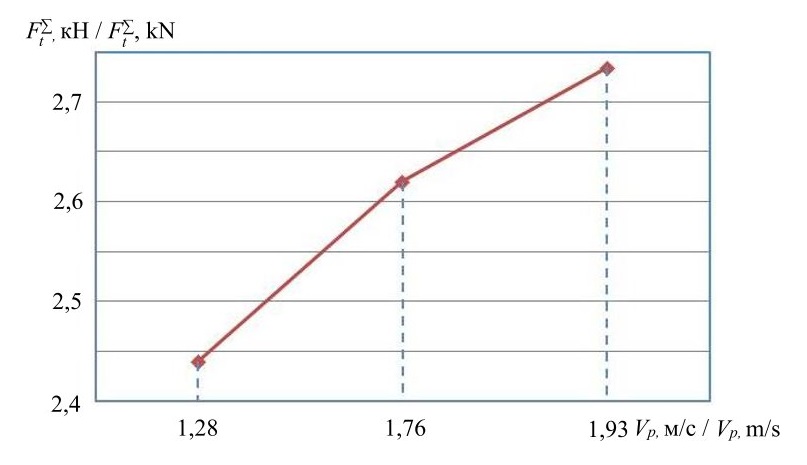 Полученные данные позволили установить закономерность изменения суммарной силы сжатия почвенного пласта рабочим органом при скорости его перемещения Vp от 1,28 до 1,93 м/с, которая описывается следующей зависимостью:
