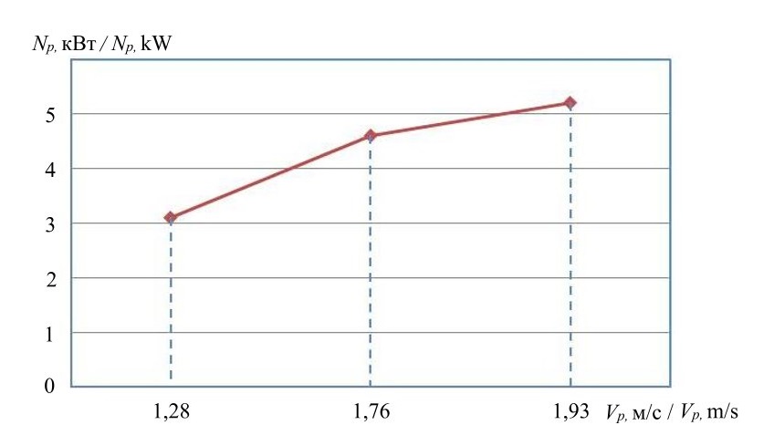 При повышении скорости Vp перемещения рабочего органа от 1,28 до 1,93 м/с мощность затрачиваемая на сжатие почвенного пласта увеличивается от 3,12 до 5,3 кВт.